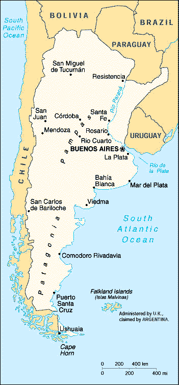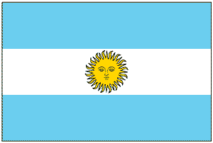 アルゼンチン(Argentina) .ar首都 ブエノスアイレス (300 万) (Buenos Aires) 南米南東部の国; 公式名 アルゼンチン共和国, 3400 万。 白人(スペイン系・イタリア系) 85%, インディオ, メスティーソ。 公用語: Spanish. 宗教: カトリック。通貨 peso. 南米大陸第 2 の国土面積. Andes 山脈 (最高峰 Aconcagua 6960 m) がチリとの国境をなし, 山脈東部に広がる国土は北は森林, 中央は肥沃なパンパス, 南は荒れ地. 食肉生産・加工が盛んです。 国名はラテン語の argentum、つまり銀に由来することは、かなり知られていますが、では銀がアルゼンチンで採れたのかというと、どうもそうではないようです。確かにリオ・デ・ラ・プラタ Rio de La Plataという川があり、スペイン語で銀の川で、1816年に独立を果たした時は、リオ・デ・ラ・プラタ合衆国だったそうですが、実は、そこの現地人から銀を入手したからだ、ということです。その後、スペイン語の名前は気に入らないと、ラテン語を使うことになったそうです。 国旗は独立運動の指導者、ベルグラノ将軍の考案になるものだそうで、上下の空色は海と空を表していて、スペインへの反乱軍の軍服の色だったそうです。アイスランドの空と海の色とはかなり違います。お国柄でしょう、明るく、軽やかです。中央の太陽の塔のシンボルみたいなのは、こちらの方が、先口で、「五月の太陽」と呼ばれる、独立運動のシンボルです。お隣のウルグアイも同じようなエンブレムがあって、根は同じなのでしょう。Belgranoはサッカーのチーム名にもなっています。 →アルゼンチン大使館 →南アメリカの地図 ↓アルゼンチンの地図