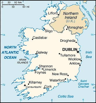 アイルランド(Ireland) .ie首都 ダブリン (54 万) (Dublin) Britain 島の西に位置する島; 英国領である北部の Northern Ireland を除いて一つの国になっています。350 万。1801-1921 年の間は United Kingdom of Great Britain and Ireland の一部でしたが、 1922-37 年 Irish Free State として英国の自治領になり、 37 年英連邦内の独立国となり, 49 年共和国となって英連邦から脱退しました。アイルランド人 (ケルト系). 公用語: Irish Gaelic (使用者は小数), English. 宗教: カトリックがほとんど, アングリカン 3%. 通貨: punt。 アイルランドの古い呼び名はエリン Erinで、これはイギリス、つまりグレートブリテン島から見て、「西に住む人」を意味していました。これが、なまって、Eire エールになり、綴りもなまってIreになってこれに、landがくっついて Irelandになり、また、読みも訛ってアイルランドになったんだそうです。アイルランドの歴史については、アイルランド大使館に日本語で手頃に詳しくまとまったのがありますのので、ここでは触れません。 国旗の色ですが、緑はカトリック教、オレンジは、新教、つまりアングリカンだそうで、白が、その間の平和と友情を意味するのだそうですが、そう、ありたいという願望なのでしょう。欧米、アラブの世界では宗教の融和、つまり神様の近所づきあいはなかなか難しいようです。日本の神々の鷹揚さを少し見習ったらいいでしょうに。国旗には紋章はありませんが、政府機関とかが使う、それからコインの表側につける紋章がありますので表示しておきました。アイリッシュハープです。優雅な姿をしていて、さすが誇りにするだけのことはあります。 アイルランドの文化に関しては、佐納康治というの大学の先生の旅行記があるので紹介しておきます。コンピュータとか情報の教授のようですが、世界中、旅をされています。 →聖パトリック祭(3月17日) →アイルランド大使館 →ヨーロッパの地図 ↓アイルランドの地図