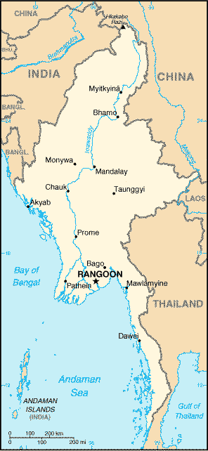 ミャンマー(Myanmar)旧称 ピルマ(Burma、 Myanmar は現地語名) .mm首都 ヤンゴン (250 万) (Yangon; 旧称 Rangoon) 南アジアの国; 公式名 the 8nion of & (ミャンマー連邦), 4400 万。ビルマ族 70%, シャン族, カレン族, カチン族など. 公用語: Burmese. 宗教: 仏教が大部分. 通貨: kyat。 ビルマの歴史は9世紀、中国・チベット国境・雲南方面からイラワジ川の中流(Irrawaddy 今は Ayeyarwaddyと書くようです。)に住み着いた時代まで遡ることができるようです。北から南に国土を縦貫してインド洋に注ぐこの川は "Road to Mandalay"として知られた主要な輸送路でした。それ以前にも西暦のはじめ頃にモン Mon族がシッタン Sittan川下流地方に定着し、農耕技術やヒンズー教・仏教がインドから伝えられていたそうです。この雲南方面から南下した種族が先住民を同化吸収し、ついでに仏教に帰依して1057年にはイラワジ河畔のパガンに最初のビルマ帝国、パガン Pagan王朝が成立します。それが1287年にモンゴルのフビライ汗(Kublai)の軍によって完膚無きまでにやられていくつかの国に分裂しました。その名残が山岳地方に住むシャン族(Shan)やカレン族(Karen)で、事実上は独立というか中央の支配を受けていません。 その後、16世紀中頃にはトゥングー TaungNgoo朝が,18世紀にはアラウンパヤ朝が成立しました。15世紀末にはポルトガル人が来て商業基地を作りましたが、支配を広げることはできず、1613年にはポルトガル軍を決定的に敗北しました。 18世紀頃にはイギリス支配下のインド、つまりブリティッシュインディアと衝突が始まり、これは他のヨーロッパの国とは桁違いな強敵で第一次ビルマ戦争(1824-26)で一部がイギリス領土となり、第二次ビルマ戦争(1852)で南半分が、インドの一州になりました。北に残った Kone Baung王朝のミンドン王 Mindonは石油の国有化など、国力の増強につとめましたが、その王子のThibawの代には、ついに第三次ビルマ戦争(1886)となり、結局、国全体がブリティッシュインディアに組み込まれました。 経済的にはイギリスの恩恵を受け、インドから切り離されたのは1935年のことで、自治領とする約束でした。ところがそこに、1942年に日本軍がイギリス軍を追い出しました。ミャンマーの建国の英雄でスーチー女史の父であるアウン・サンは最初、イギリス軍がいなくなって喜んだのですが、やがて日本にビルマの独立を認める気がないのを知ると、イギリスと連絡をとり、戦後に独立を認める約束で、強力な一万の兵を連合軍側につけさせることにしました。 かくて、1948年に晴れて独立を果たしました。その後、山岳民族の分離の動きはくい止めましたが、完全な支配下におくことは出来ずにいます。 アウン・サンはしかし、この独立を前に政敵に暗殺され、親密な同士であったウ・ヌー U Nuが、後をついで首相となり、しばらくは平和の時を持ちました。そして1962年に選挙で勝利したのですが、ネ・ウィン Ne Winがクーデターに成功し、民主主義は終わりを告げました。 国名ですが、1989年にビルマ政府は国名をミャンマーと改めることを宣言しました。このとき、首都のラングーンもヤンゴンと改めました。一応はそうなのですが、軍事政権を承認していないアメリカとかオーストラリアはまだビルマと呼んでいるようです。これに関してはミャンマー外相のウ・ウィン・アウン U Win Aungが次のようなことを言っています。 しかし、この議論はこのままでは終わらない可能性があります。ビルマの名称はアウン・サン・スー・チー女史が今も使っているからです。一説によると、ビルマもミャンマーも同じ意味で前者が文語的なのに対してミャンマーは口語的で人々はどちらも使っているというのがあります。英語版のWikipediaもこの説です。 ビルマの英語は Burmaで、バーマということになりますが、日本ではどうしてビルマと呼んでいたのか、これについてはポルトガル語から、というのとオランダ語からという説があるようですが、付き合いの長さから言うとオランダ語の Birmaからと考えられますが、最初にミャンマーに乗り込んだのはポルトガル人のようで、オランダ人はポルトガル語のBirmniaを参考にしたのではないでしょうか? 国旗は現在の国旗は旧ビルマ革命政府が1974年に制定したもので、赤は勇気と団結、青と白い星は進歩と純粋性、14の星は州の数、稲穂は農民、歯車は労働者を表すということです。別にそれ以前と違ったわけではなさそうです。 ミャンマーの文化に関しては、佐納康治というの大学の先生の旅行記があるので紹介しておきます。コンピュータとか情報の教授のようですが、世界中、旅をされています。 →アジアの地図↓ミャンマーの地図