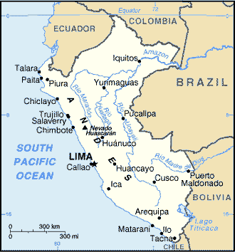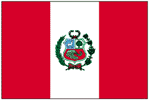 赤白赤の旗はアンデスにいるParihuanaとかいう絶滅に瀕している鳥の、白い胸と赤い翼から発想したものだそうです。一応意味づけがあって白は平和と名誉を、赤は勇気と愛国心を象徴するということです。紋章の中、左肩は国の動物になっている vicunaというラマの仲間、右側はキニーネ quinineの木でこれも特産品です。下には金の角笛から小判がジャラジャラと鉱物資源の豊かさを表すのだそうです。 ところで、私が一番、頼りにしているサイトによると、紋章のない、単に赤白赤の旗が普通に国民が使う旗で、紋章入りは戦旗とか特別の場合だけに用いられるもののようです。 →ペルーの祭り ほとんどカトリック関係ですが、クスコのインティ・ライミ祭はインカ時代から引き継がれたもののようです。時間ができたらもう少し調べます。 →リゾート地と遺跡の紹介サイト →インカ/ペルーの歴史 →ナスカの地上絵 →南アメリカの地図↓ペルーの地図