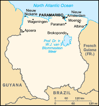 スリナム (Suriname) .sr首都 パラマリボ (10 万) (Paramaribo) 南米北東部の国; 公式名 the Republic of Suriname (スリナム共和国), 42 万。インド系 37%, 白人と黒人との混血 31%, インドネシア系 15%, 黒人 10%, インディオなど. 言語: Dutch (公用語), English, Sranan (英語をベースとしたクリオール語) など. 宗教: キリスト教, ヒンドゥー教, イスラム教など. 通貨: guilder. 1975 年オランダより独立。 民族構成は複雑なことになっています。人が住んでいたのは紀元前3,000年に遡るらしいですが、それは地球上はたいていはそうなのでしょう。とにかくこの地にはネイティブ・アメリカン(以前はインディアンと呼んでいました)のアラワク族が遊猟と遊漁で暮らしていたようです。そこへカリブ海のカリブ族も移ってきましたが、このあたりまでは、今はインディオとしてひっくくられているわけです。 1650年にイギリス人が植民をはじめましたが、オランダに占領されます。1667年に両国は条約を結び、オランダの北アメリカの植民地・ニューアムステルダム(これが今のニューヨークです。)と交換にスリナムはオランダのものになって、オランダ領ガイアナということになりました。その後、オランダがナポレオンのフランスに併合されるとイギリスが再び占領しますが、1816年にはオランダに返還されています。 18世紀前半は農業で栄えました。そのもとはご多分にもれずアフリカから連れてきた奴隷です。その扱いはひどく、マルーン maroonと呼ばれる逃亡奴隷になって治安を乱すようになりました。オランダが奴隷制を廃止するのはヨーロッパの国では一番遅く、1873年です。次にオランダはオランダ領東インドなどから中国人、インド人などを労働者として連れてきました。こうして民族構成は複雑になってきたわけです。 話は飛んで1973年にオランダは独立を認めます。しかし、民族構成が複雑なゆえに不信が不信を招き、反対派がオランダに逃亡したり、クーデターが起きて軍政になったり、マルーンの反乱があったりと、政情は安定しないようです。 国名はインディオの言葉で「岩場の多い川」(スリナム川)に由来するということですが、この地域に住んでいたスリナン族 Surinenに由来するというのもあります。アラワク族にもいろいろあって、その岩場の多いスリナン川沿いのアラワク族はスリナン族だったのかも知れません。 国旗は緑は豊かな国土を、白は正義と自由を、赤は進歩と繁栄を、黄色い星は多民族の団結と金色の未来を象徴するということです。赤は 進歩と愛をというのもあります。 →スリナム・アメリカ大使館(英語) →南アメリカの地図 ↓スリナムの地図
