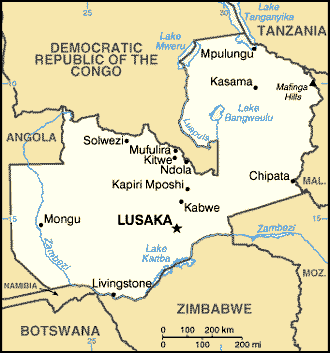 ザンビア(Zambia) .zm首都 ルサカ (64 万) (Lusaka) アフリカ南部の内陸国。公式名 ザンビア共和国, 人口 10,462,436人(2004)。国土面積 752,614 km2。ほとんどがバントゥー系諸部族. 言語: English (公用語だが使用者は少数), Bantu 系諸語 (Bemba, Tonga, Nyanja など)。 宗教: 土着信仰, キリスト教, ヒンドゥー教, イスラム教. 通貨: kwacha。もと Northern Rhodesia, 1964 年独立, 英連邦に加盟。 2000年くらい前、原住の採集民族が先進民族に取って代わられはじめたようです。15世紀にはバンツー族が流れ込みはじめ、17世紀末から19世紀はじめにかけて最高潮に達しました。かれらは主として現在のコンゴ民主共和国南部およびアンゴラ北部からやってきましたが、19世紀には南から来たンゴニ族と合流して19世紀後半には現在のザンビアが形成されました。 ヨーロッパ人は時折、ポルトガルの探検家が来たほかは数世紀にわたってノータッチでした。19世紀半ばになって探検家、宣教師、商人が来るようになりました。リヴィングストンはザンビア川の壮大な滝を見た最初のヨーロッパ人で、ビクトリア滝と命名し、その近くの町は彼の名前に因んで命名されました。 1888年にイギリスのセシル・ローズ Cecil Rhodesが地方の族長から採掘権を獲得し、イギリスはローデシアを影響下におきました。ローデシア Rhodesiaはローズの名前から取ったようですが、現在は北がこのザンビアと南がジンバブエです。そして保護領とかにしていました。北部ローデシアと南部ローデシアは、分離して統治していたようです。 1953年に南北ローデシアは東隣のニャサランド Nyasaland、現在のマラウィと中央アフリカ連邦を組みますが、現地人の政治参加要求とヨーロッパ人が政治権力への執着で特に北部ローデシアで、たびたび暴動になっていました。1962年にどういう仕組みか知りませんが二段階選挙が実施され、アフリカ人が多数を制し、北部ローデシアは連邦を離脱する決議書を可決し、翌年、連邦は解消され、1964年、北部ローデシアはザンビア共和国となりました。南部の白人の支配するローデシアも1965年に独立を宣言します。 アフリカ人が政権を握ってみると、もともとは鉱物資源に恵まれているのですが、政府運営を託せる教育を有する人物は少なく、経済は外国人に握られているという困難に直面しますが、それでも白人支配に対する抵抗派を支援し、西隣のアンゴラ解放連合(UNITA)やジンバブエ人民連合(ZAPU)、南アフリカのアフリカ国民会議(ANC)や、南西アフリカ人民機構(SWAPO)などを援助します。 結果、南部ローデシアとの国境は封鎖され、電力と鉄道輸送の危機に直面しますが、ザンベジ川に建設した Kariba水力発電所が必要をまかない、鉄道は中国の援助で東隣のタンザニアのダルエスサラームまで通じました。ところが周辺の元ポルトガル領・モザンビーク、アンゴラは1970年に独立するのですが、内戦が起こり難民が押し寄せてくる、西海岸への鉄道はアンゴラを経由するのですが、輸送がままならない、ANCを支援していたため、南アフリカがザンビア内のANCを攻撃するといった具合、加えて、主要な輸出品たる銅の値段が下落して経済困難に陥り、1990年代にはザンビアの一人あたり負債は世界最高になりました。 国名はザンベジ川の名に由来します。バンツー語で zambezu 「巨大な水路」という意味だそうです。 国旗は国土を表す緑をベースに、自由を勝ち取ったワシの紋章と、三色旗みたいな部分の赤は独立のための戦い、黒は国民を、オレンジ色は豊かな鉱物資源を表しているそうです。 →駐日ザンビア大使館(外務省のページで住所がわかるだけです。) →アフリカの地図 ↓ザンビアの地図